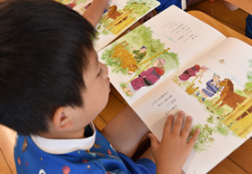 絵本は心のごはん。先生が読む絵本の世界に浸り込みながら、豊かな言葉や表現、ひいてはコミュニケーション能力等の社会性の基礎を育みたいと考えます。先生やお友達と物語の中を冒険しながら、生活や遊びを豊かにしていきます。遊びや学びにつながる絵本を先生達は日々クラスに準備しています。